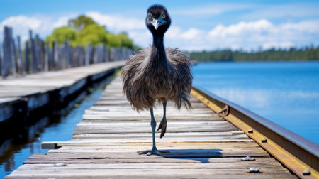 a bird stands on a dock over water, showcasing attention to fur and feathers texture. the comical choreography of this national geographic photo captures quirky character designs against the backdrop of the australian landscape. the black and azure colors add depth, while the afro-caribbean influence adds a unique touch to the scene. ai generated