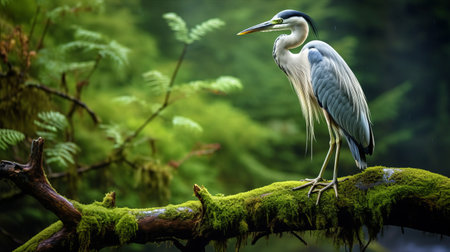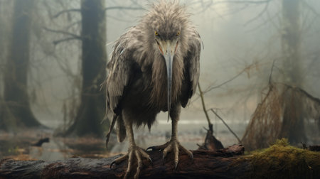 grey heron standing in a forest, surrounded by trees and logs, reminiscent of dark fantasy creatures. this captivating image captures the raw emotion and close-up intensity of the heron, resembling a manticore made of feathers. inspired by the works of bill gekas and gabriel metsu. ai generated