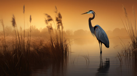 Great blue heron at sunrise in misty wetlands. That the image is generated using AI.