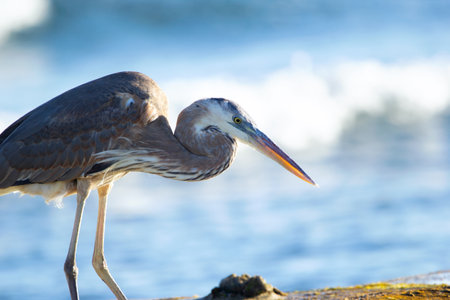 Great blue heron is standing on the rock in the ocean coastline and fishing in a sunny day, blue sea and waves on the background.