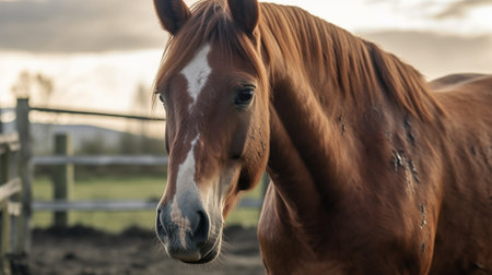 A brown horse looks into the camera. Portrait of a horse. ranch at sunset