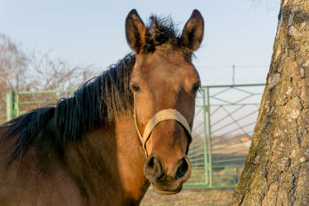 Horse portrait in the paddock. Brown horse with black mane