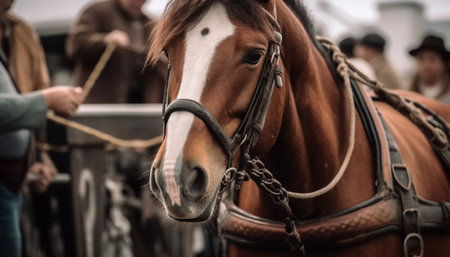 Thoroughbred stallion in bridle, focus on mane, outdoors on farm generated by artificial intelligence