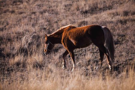 Dark chestnut horse walk in the yellowed grass