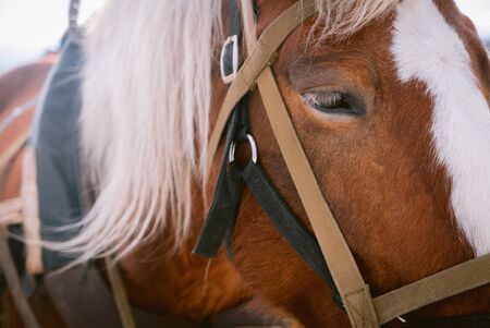 Muzzle of an Old Horse in Harness on a Sunny Day. Close Up