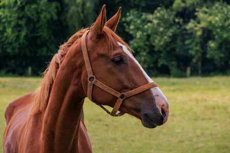Side shot of a beautiful young warmblood horse. He is listening with his ears perked up. Beautiful chestnut color.