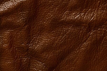 Detailed macro of wrinkled brown leather fabric, showing its rich, textured surface with natural grains and a luxurious finish.