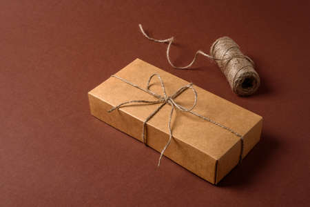 String or twine tied in a box on kraft paper. gift concept. top view.
