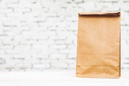 Blank paper bag with copy space for your brand on table against white brick wall background