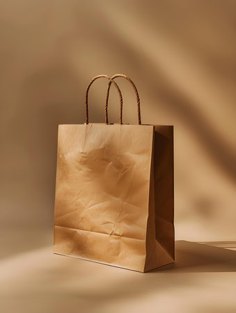 Brown paper shopping bag standing on a white table near a green plant in a pot, promoting eco-friendly packaging and sustainable practices in retail