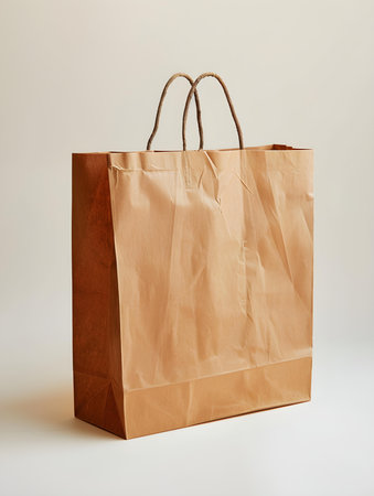 A brown paper bag is sitting on a white background. The bag is open and has a folded top. Concept of simplicity and minimalism, as the bag is made of a basic material and has a simple design
