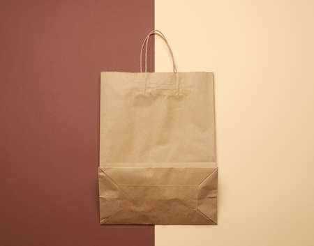 brown paper bag with handles for shopping on a brown background, flat lay, concept of rejection of plastic bags to save the environment, top view