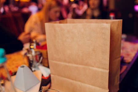dessert paper bag waiting for customer on counter in modern cafe coffee shop, food delivery, cafe restaurant, takeaway food.