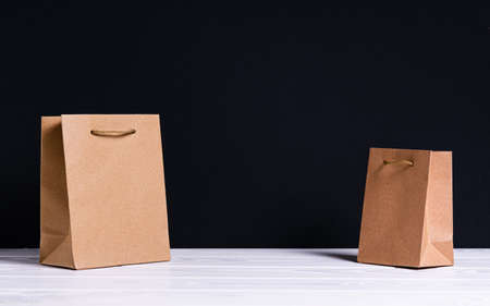 Kraft paper shopping bags on wooden table with brown background