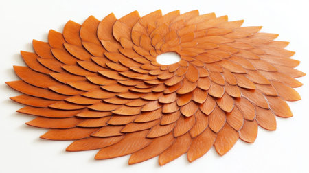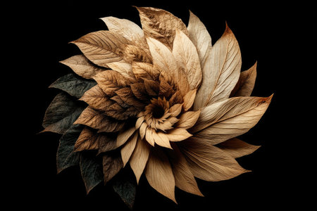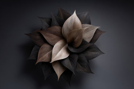 An overhead view reveals an abstract floral composition crafted from layered leaves. The arrangement features a gradient of colors, ranging from dark to light brown, against a shadowy, dark backdrop. This artistic display suggests a studio setting, suitable for visual media and design projects.