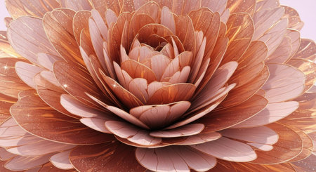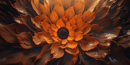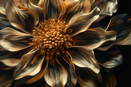An artistic rendering presents a close-up view of an abstract floral form. The petals exhibit a metallic bronze sheen, contrasting against a deep black background. The composition features a central spiral, with light and shadow emphasizing the textures. This image could be suitable for various design projects and commercial applications.