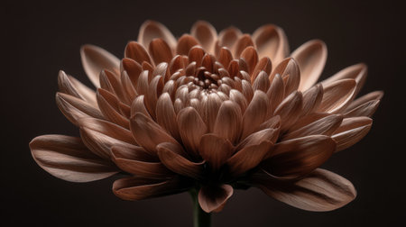 A close-up view of a brown chrysanthemum, showcasing its layered petals and intricate details, set against a dark backdrop, enhancing its natural beauty.