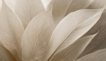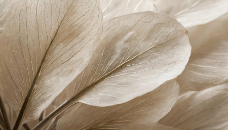 A serene abstract design showcasing flower petals with beige hues and translucent leaves against a textured natural backdrop. Ideal for nature aesthetics, artistic creativity, or elegant visual