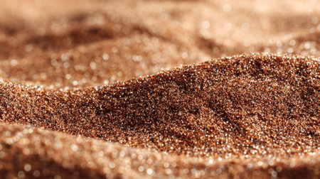 Sparkling brown sand creates smooth, undulating waves in a serene beach setting. The light emphasizes the textures and twinkles of the grains, enhancing the natural beauty.