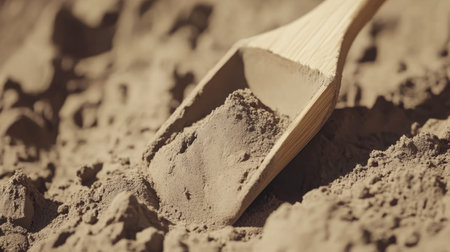 This image showcases a wooden scoop filled with fine sand, emphasizing natural textures and warm tones. Ideal for themes of construction, nature, or craft.