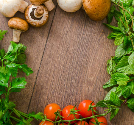 Champignon mushrooms with other ingrediants and vegetables in the rustic kitchen