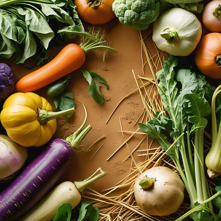 A vibrant overhead view showcases a diverse collection of fresh vegetables and gourds arranged on a textured, earthy-brown surface. Prominently featured are bright orange carrots, a yellow pumpkin, a deep purple eggplant, and various green leafy vegetables. Interspersed among the produce are stalks of straw, adding a rustic element. Other vegetables visible include cauliflower, broccoli, onions, and white turnips.