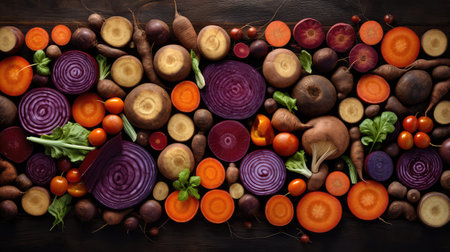 Colorful arrangement of fresh vegetables, fruits, and herbs on artistic background from above