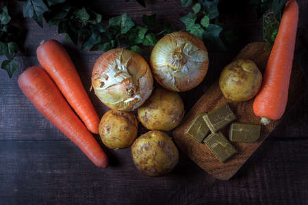 Raw unpeeled potatoes, onions, carrots and curry on the wooden table