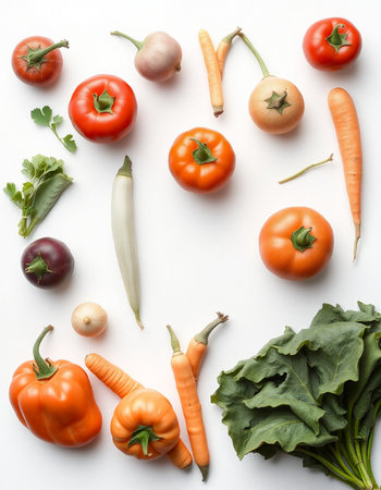 Vibrant arrangement of fresh vegetables including tomatoes, potatoes, and leafy greens, ideal for healthy eating themes.