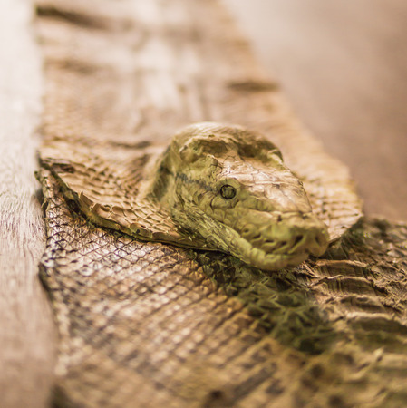 Head python yellow pattern on a table edge. Close up of snake skin texture use for background. Portrait of a Albino reticulated python snake. Beautiful reptile. International Snake Day, July 16th.