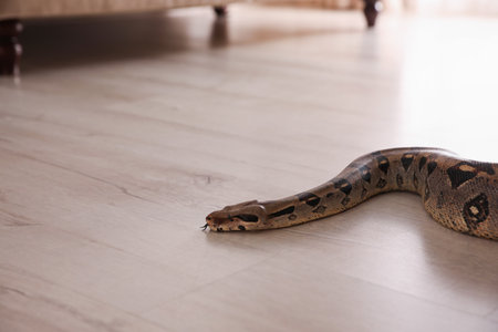 Front part of snake or adder with black eyes creeping forwards over reflective flat surface while hunting and following victim