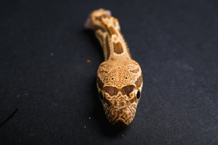 Closeup shot with selective focus of pet serpents head as it sheds its skin. Sly serpent shedding over stone structure in its glass enclosure