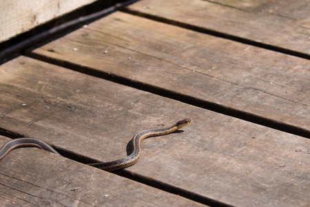 Grass snake crawling on a brick tile. Non-poisonous snake. Frightened by the Grass snake.
