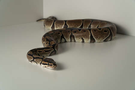 ball python on a brown wood color. Ball python (python regius) crawling on hand with selective focus and copy space, Background for exotic pets or animals and wildlife concept.