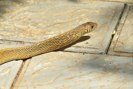 A small snake on the cement floor pose ready to fight the enemy.Painted keelbacks,It is an animal that is not poisonous, but a ferocious habit.