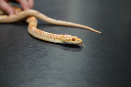 Pet rat snake being held in the by mans hand in studio, out of focus owner with black material background selective focus shallow depth of field