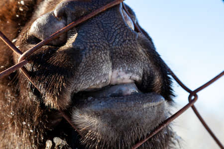 A close-up on the nose, face, and jaw of a ruminant cow, bull, bison, or horse, which pokes its mouth through an iron mesh fence. Capturing and keeping animals in captivity.