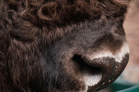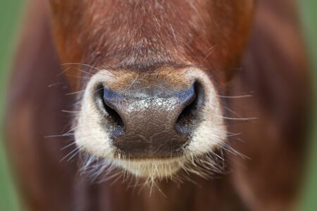 Cow nose close-up, in bright sunlight. Macro image of a cow snout. Red fur cow snout. Domestic animal nose. Brown ox nose close-up.