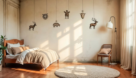 Minimalist kids room interior with pastel animal prints on white background creates a calm and cozy atmosphere in the nursery.