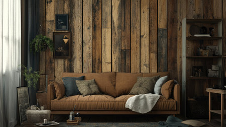 Wallpaper with a rustic wood panel design, creating a warm, cozy atmosphere in a living room setting.