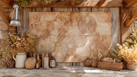 This backdrop showcases old cartography designs along with various natural decorations and vintage items arranged on a wooden shelf.