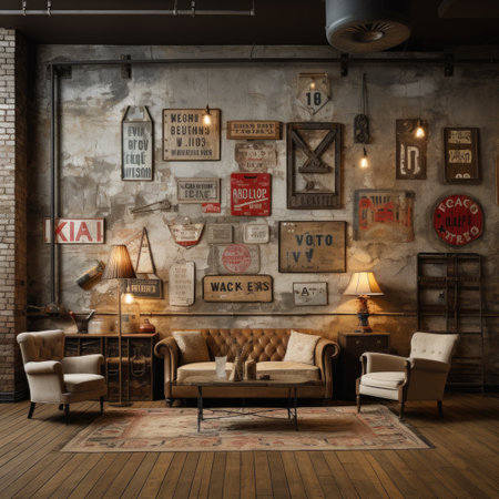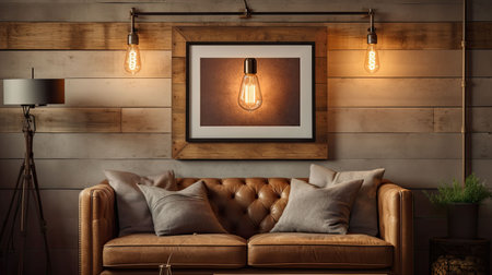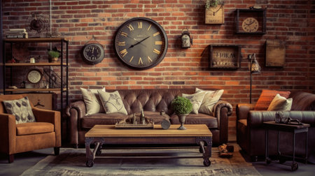 Living room decor, home interior design . Rustic Industrial style with Brick wall decorated with Reclaimed wood and Metal material . Generative AI AIG26.