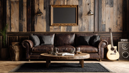 An inviting living space features a brown leather sofa, set against a wooden panel wall. A round coffee table and guitar enhance the scene. Warm lighting creates a cozy atmosphere. The room's design is suitable for interior design projects and general commercial applications.
