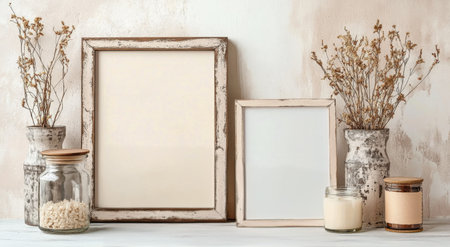 Two rustic wooden frames stand side by side on a minimalistic surface. Dried flowers in glass vases and a candle enhance the serene ambiance, complementing the soft wall texture.
