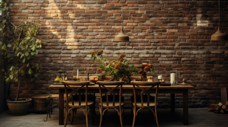 Warm interior features wicker chairs and wooden furniture against a brick wall creating a comfortable atmosphere Perfect for showcasing interior design or cafe concepts.
