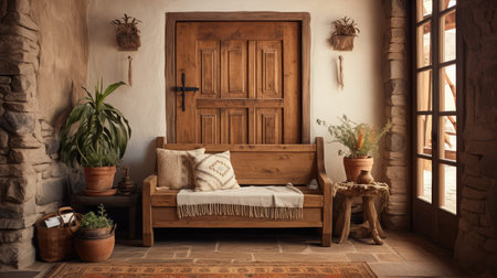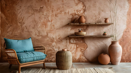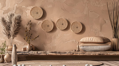 Serene minimalist interiors with natural textures and warm colors. Interior design composition with copyspace for text.
