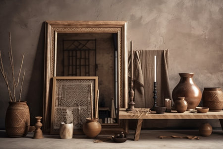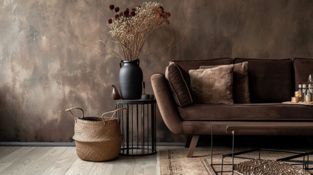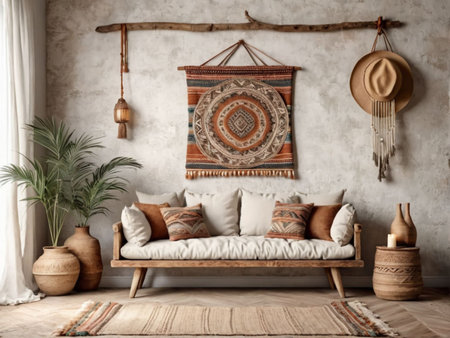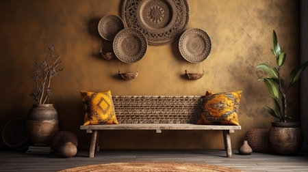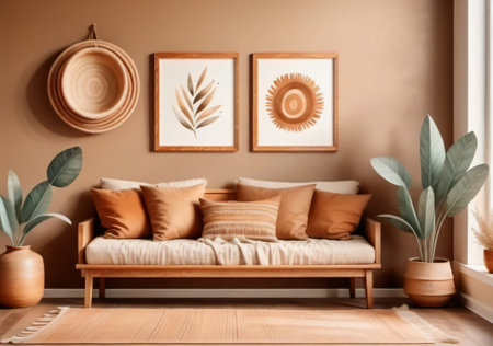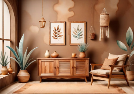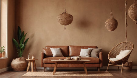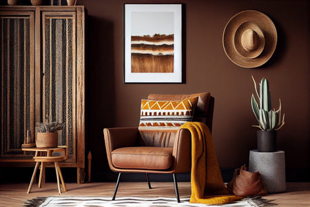 Home interior with ethnic boho decoration, living room in brown warm color, 3d style. Generative Ai.