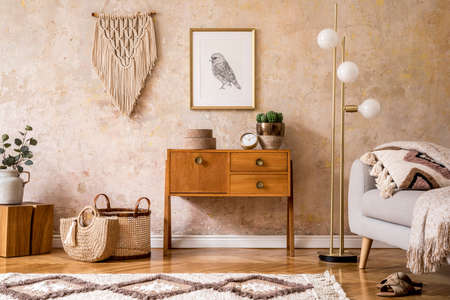 Modern retro composition of living room with wooden vintage commode, gray sofa, gold lamp, macrame, carpet, pillows, gold mock up poster frame, plants, decoration and personal accessories.