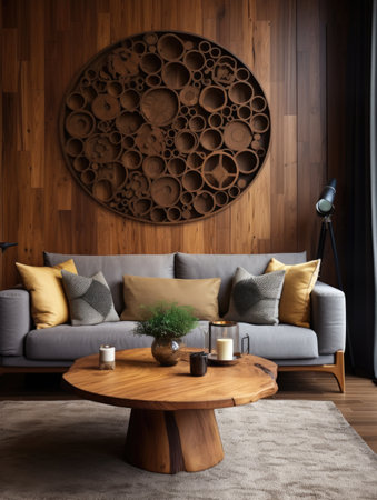 Rustic loveseat sofa and round wooden wall decor. Interior design of modern living room