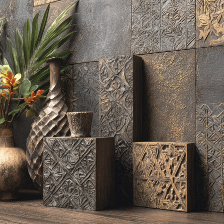 This image features a collection of carved objects and vases against a textured wall. The composition displays a variety of relief patterns and earthy tones. The lighting suggests an indoor setting. These decorative elements may be suitable for interior design projects or other artistic visualizations.